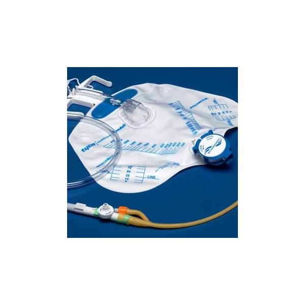 Mono-Flo anti-reflux device foley tray with Safeguard Needleless Sampling Port and Splashguard II. Drain Spout includes: Ultramer Latex Foley Catheter (17") and CURITY Drain Bag (KND6308). 100% Latex-free Standard Prep Tray Includes: Sterile CSR Wrap, Fenestrated Drape, Underpad, Nitrile Exam Gloves, Forceps, Prepping Balls, 10 cc Prefilled Sterile Water Inflation Syringe, Unique Bellows Lubricant Syringe, Povidone-Iodine Solution, Specimen Container and Label.