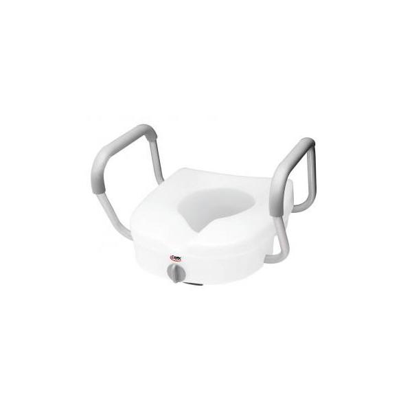 Assists those with bending or sitting difficulties. The easy-to-use locking mechanism secures the raised toilet seat to the toilet bowl. Comes with padded armrests. The smooth contour seat has built-in hand grips for easy handling and is lightweight and easy to clean. This comes with non-adjustable handles.