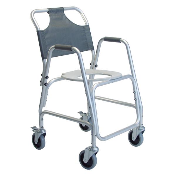 Designed for safe transport to and from the shower. Anodized, non-corrosive aluminum frame construction will not rust. Comfortable nylon backrest removes for easy cleaning. Cushioned armrests enhance user comfort. 5" swivel casters with rear wheel safety locks facilitate maneuverability in tight spaces.