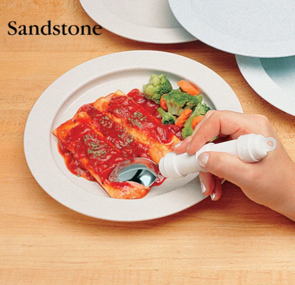 High wall with inner lip keeps food from sliding off the plate and can be used to push food on the utensil.