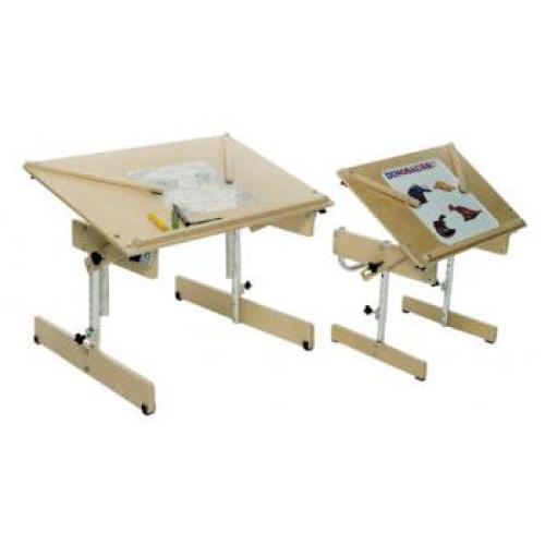 Occupational and physical therapists emphasize the importance of an adjustable-height work surface to develop proficiency in visual attention, reach, grasp and prehension. The KAYE T-Table, with its tilting work surface, permits a child to be positioned at the optimal distance from the work. This helps stabilize the eyes, head, and trunk, and insures freer movements of the scapula, arm, and wrist, all of which contributes to precise hand use when manipulating objects.