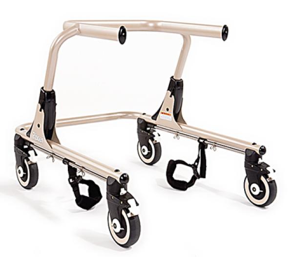 Ankle Prompts snap securely onto the frame and have comfortably padded ankle straps. The spring adjusters limit stride length and control stride placement. Strap length adjusts to determine foot separation and prevent scissoring, which is a problem with other pediatric walkers.