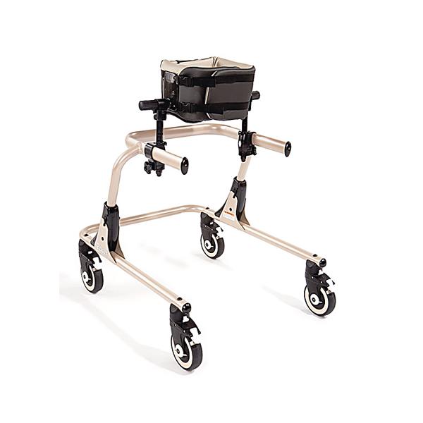 The new, padded Chest Prompt holds the torso at the desired angle. It is available in three sizes, and accommodates a wide range of users. Tilt adjusts forward or backward in 15 increments. One knob adjusts both tilt angle and width. Adjustments can be made while user is in the walker. Chest Prompt stays open for easy transfers. Fit the Chest Prompt snugly to support dependent users, or wrap loosely as a training guide for gaining independent trunk control. Cleanable padding is anti-microbial and repels UV light to stay cool. Fits all earlier models of the Pacer Gait Trainer.