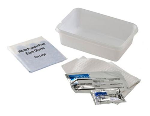 Contains: Lidded tray, under pad, latex gloves, fenestrated drape, lubricating jelly, graduated basin, BZK swab sticks (3).