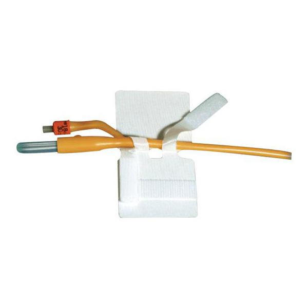 Multi-purpose, medical tube holder. The CATH-SECURE Dual tab is designed to extend from the center, wrap around the the tubing and anchor it tightly to the tape using a press-on hook-and-loop fastening system. The CATH-SECURE Dual Tab improves comfort and mobility, is lightweight and flexible. Hypoallergenic. 3" wrap tabs x 3" wide base.