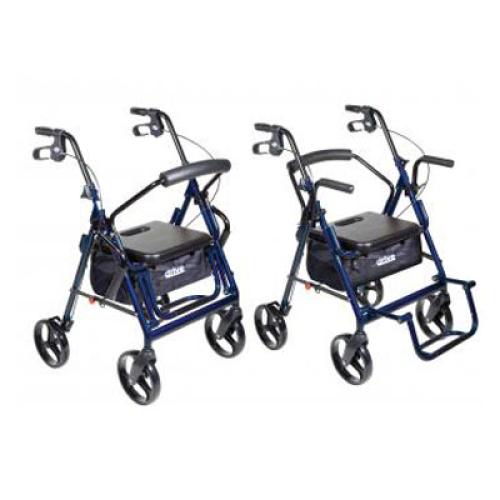 The Duet Transport Chair/Rollator by Drive Medical combines the features of a rollator and transport chair in one unit. An individual has the ability to ambulate independently or be pushed safety by a care giver. This transport chair/rollator comes with a comfortable padded seat with a large pouch underneath to easily and securely transport personal items. Inside the pouch is a convenient handle to aid with folding the chair/rollator. It has locking, flip up armrests, and a flip down footrest to aid the user while the Duet is used in the transport chair mode. Limited lifetime warranty.