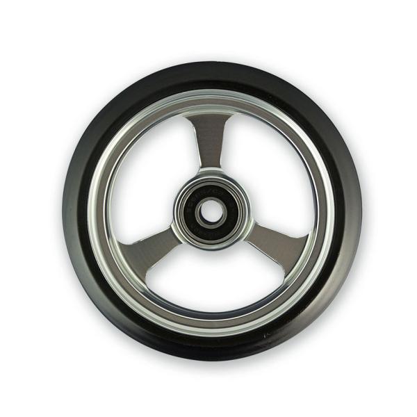 Three-spoke ultralight caster wheel with 1.4" tire width. Features a custom-made billet 6061-T6 aircraft grade aluminum hub that is machine-lathed for perfect balance. The proprietary, high rebound solid urethane tread is designed to minimize energy loss and absorb vibration. The spherical, arched tread design improves pivotability for effortless turns and enhanced stability. Sold by the each.